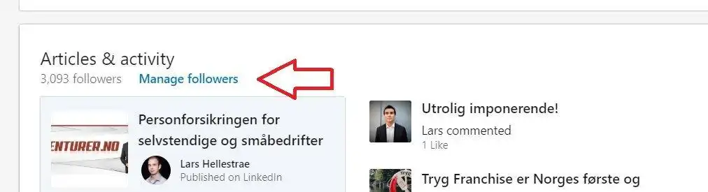 For å finne personer som følger deg, men ikke er dine kontakter så gå inn på din profilside og trykk på «Manage Followers».